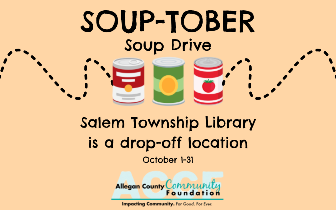 Allegan County Food Pantry Collaborative’s annual Soup-Tober Soup Drive kicks off tomorrow, October 1st! Salem Township Library is excited to be a drop off location again this year. Soup can be dropped off until October 31st.